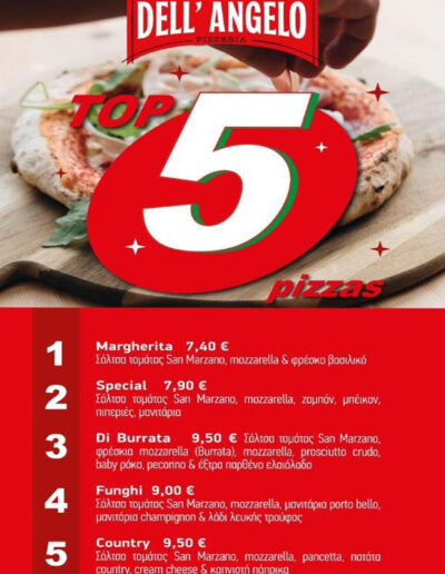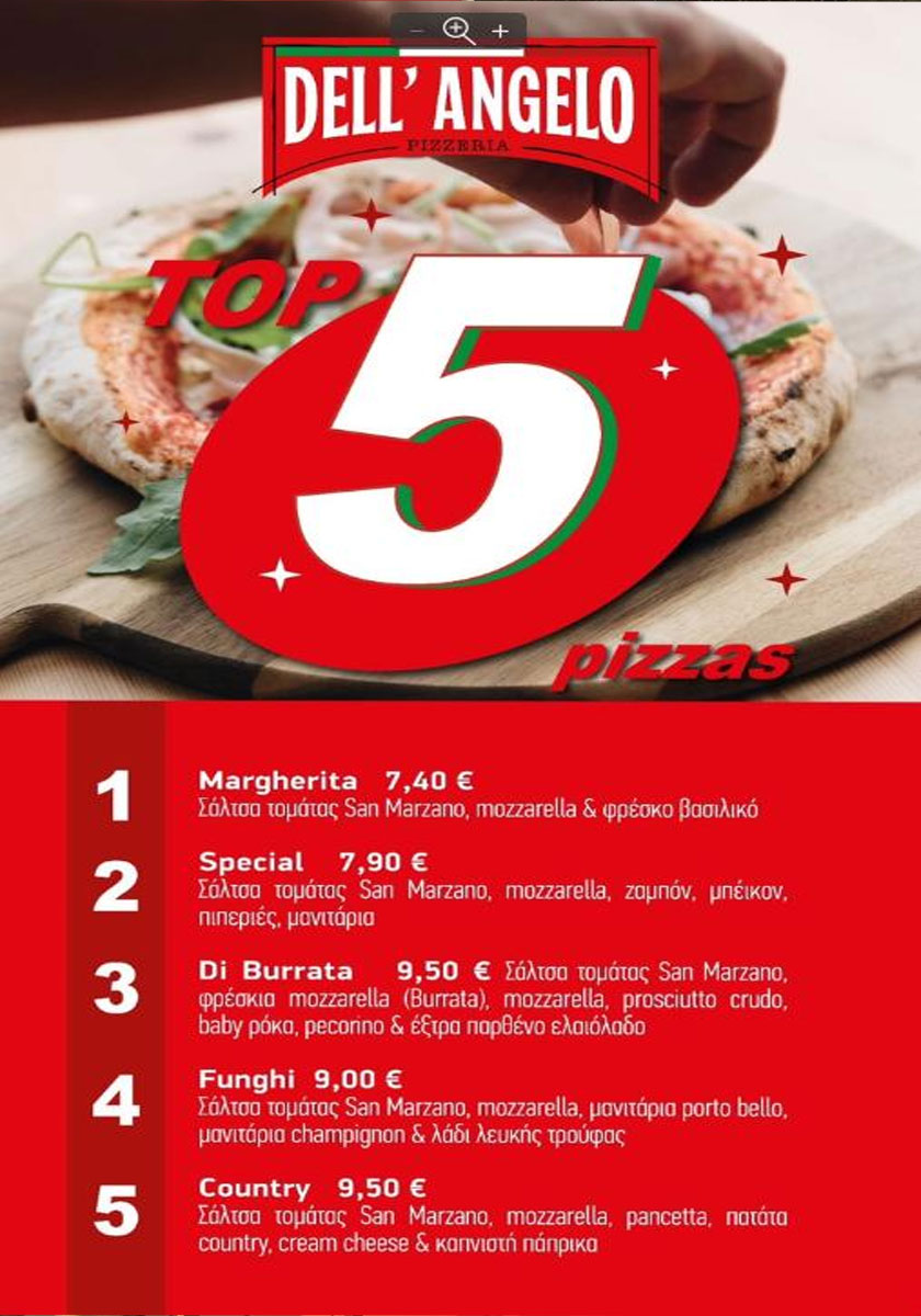 Σε ένα λιτό και εξαιρετικά καλαίσθητο χώρο η πίτσα Dell’ Angello συνδυάζεται με παραδοσιακά ολόφρεσκα υλικά και το αποτέλεσμα είναι ξεχωριστό.