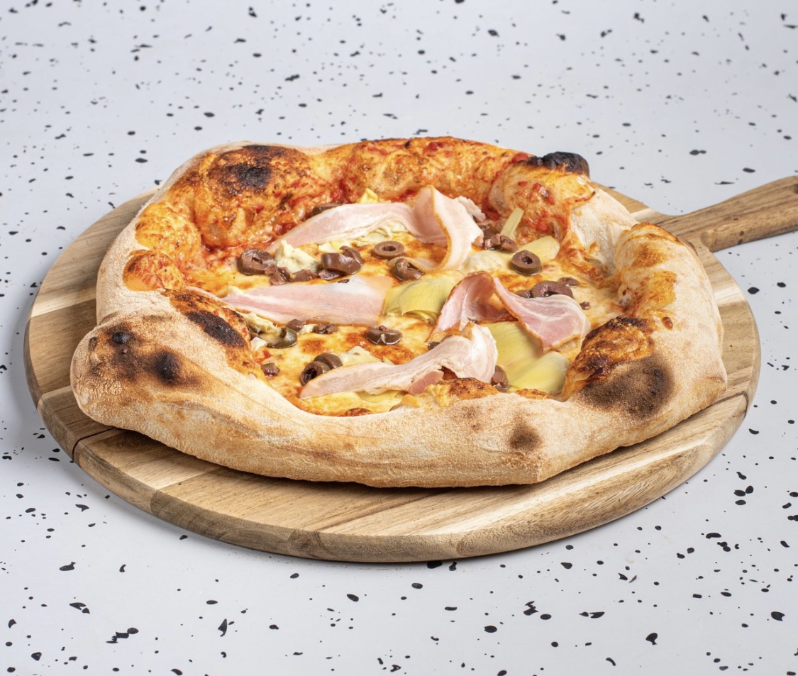 Σάλτσα τομάτας San Marano, βουβαλίσια mozzarella, (αγκινάρα) ελιά μούρη, πάστα σκόρδου, ζαμπόν & έξτρα παρΒένο ελαιόλαδο