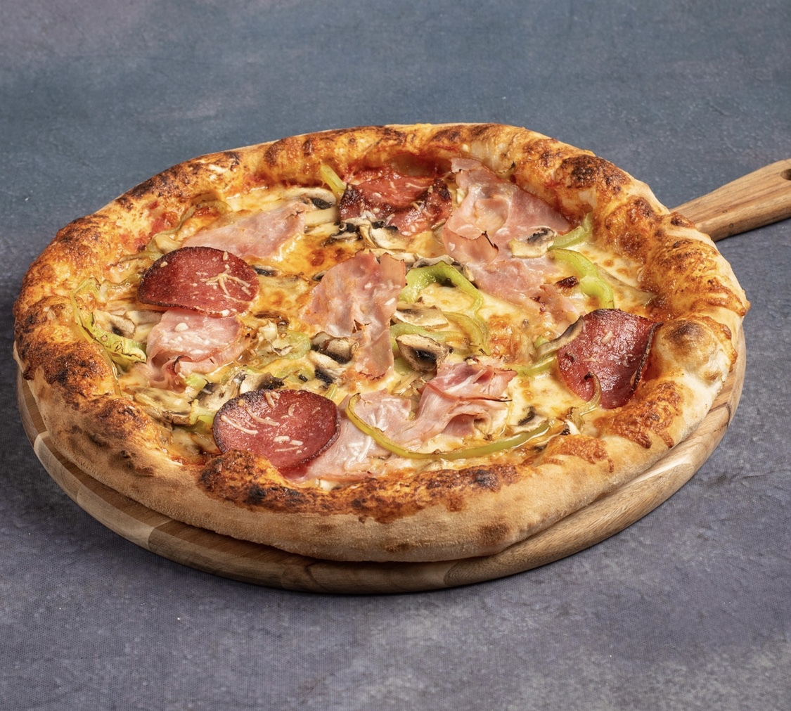 Με σάλτσα τομάτας San Marzano, mozzarella, μανιτάρια champignon, parmezana, πιπεριά, ζαμπόν & salami Milano