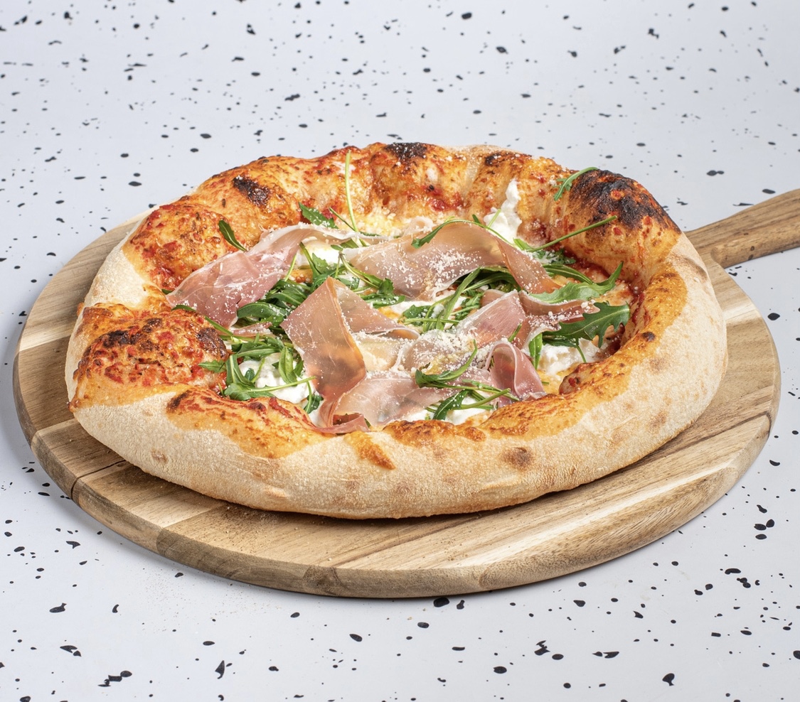 Σάλτσα τομάτας San Marzano, φρέσκια mozzarella (Burrata), mozzarella, prosciutto crudo, baby ρόκα, pecorino & έξτρα παρθένο ελαιόλαδο