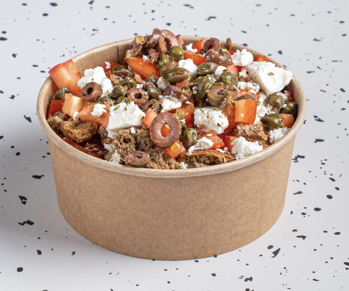 Με παραδοσιακό ντάκο, ντομάτα, ελιές καλαμών ροδέλα, κάπαρι, φέτα ΠΟΠ, φρέσκια ρίγανη & έξτρα παρθένο ελαιόλαδο
